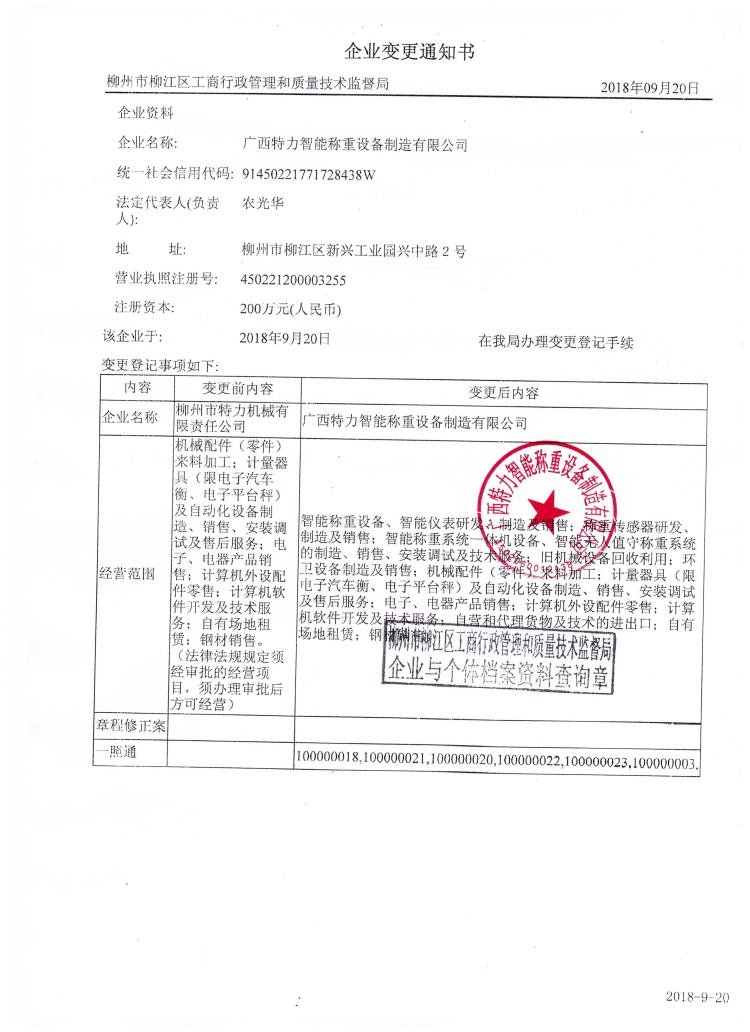 從2018年9月20日起,將原公司名稱“柳州市特力機(jī)械有限責(zé)任公司”變更登記為“廣西特力智能稱重設(shè)備制造有限公司”。公司稅務(wù)方面相關(guān)變更事宜正在辦理,在辦理完結(jié)前公司無法開票,待辦理完結(jié),公司另行通知各位。公司更名后,業(yè)務(wù)主體和法律關(guān)系不變,原簽訂的合同繼續(xù)有效,原有的業(yè)務(wù)關(guān)系和服務(wù)承諾保持不變。